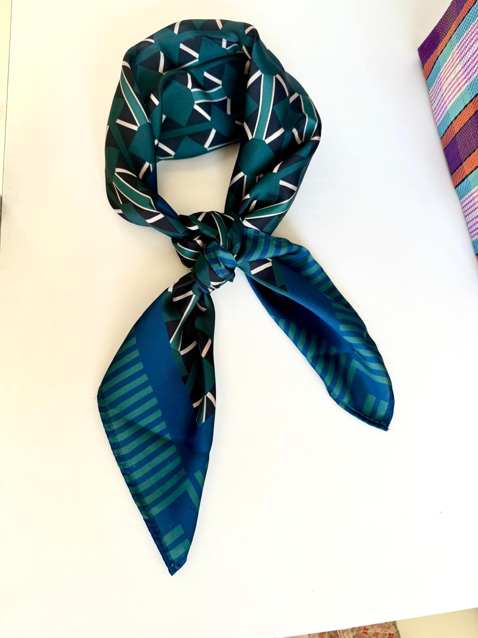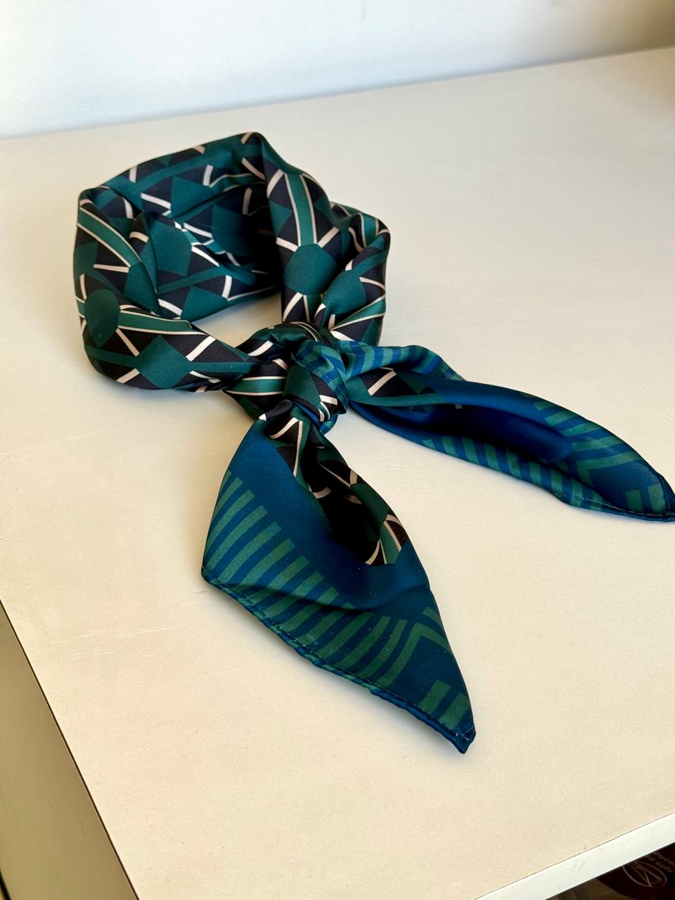 Pañuelo Fiji mate con nuestro un estampado geométrico en tonos verdes.