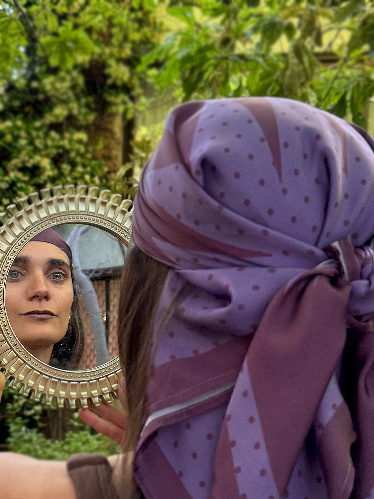 Pañuelo Fiji mate con nuestro característico estampado sol en tonos morados.